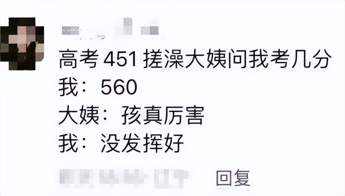 本来学生高考考了451分,但被搓澡大姨问到成绩的时候,就随口说了个560分,反正对方也不知道,还被夸厉害,这时候学生再添一句“没发挥好”,想必大姨更得觉得了不起了。