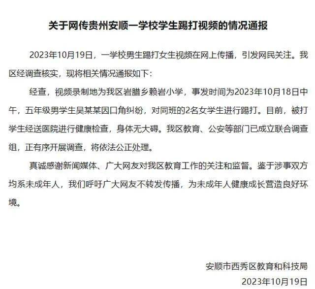 19日,贵州安顺市西秀区教育和科技局发布情况通报称,经查,视频录制地为该区岩腊乡赖岩小学,事发时间为10月18日中午,五年级男学生吴某某因口角纠纷,对同班的2名女学生进行踢打。