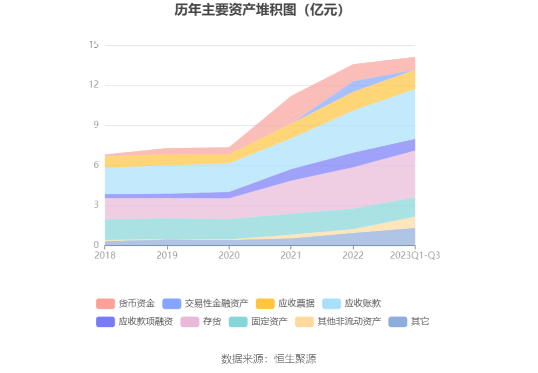 2023年前三季度,公司经营活动现金流净额为-4628.63万元,同比减少2299.06万元,主要系支付的各类采购款增加所致;筹资活动现金流净额-2059.49万元,同比减少1.02亿元,主要系本期无新增银行借款及本期股利分配所致;投资活动现金流净额5788.59万元,上年同期为-1.37亿元,主要系理财产品到期所致。