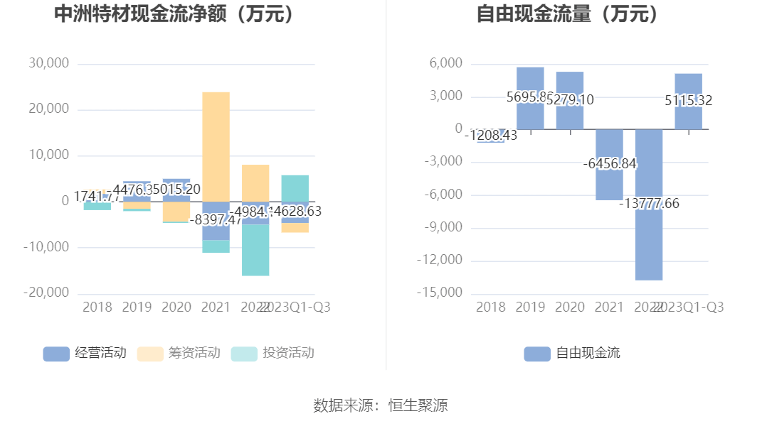 进一步统计发现,2023年前三季度公司自由现金流为5115.32万元,上年同期为-19483.83万元。