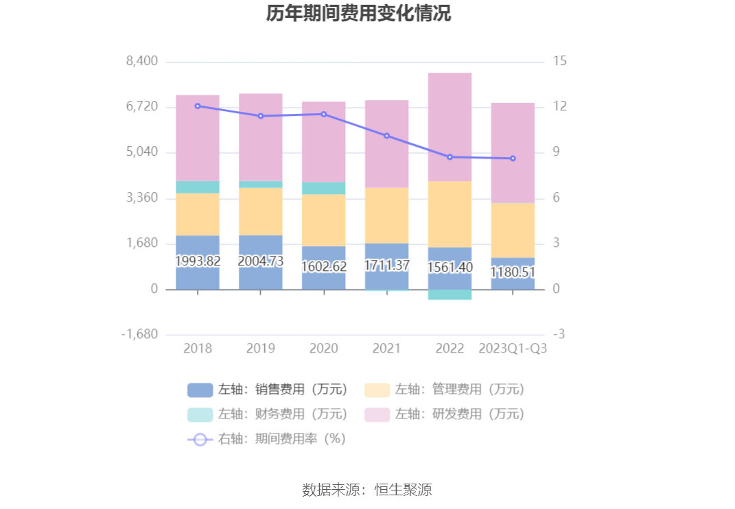 2023年前三季度,公司期间费用为6886.44万元,较上年同期增加2152.07万元;期间费用率为8.64%,较上年同期上升0.70个百分点。其中,销售费用同比增长18.84%,管理费用同比增长29.01%,研发费用同比增长40.98%,财务费用由去年同期的-427.29万元变为15.28万元。