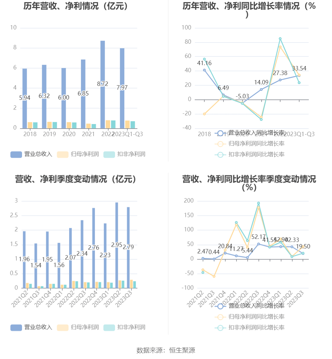 根据三季报,公司第三季度实现营业总收入2.79亿元,同比增长19.50%,环比下降5.27%;归母净利润2936.91万元,同比增长43.07%,环比增长8.72%;扣非净利润2437.8万元,同比增长20.49%,环比下降7.20%。