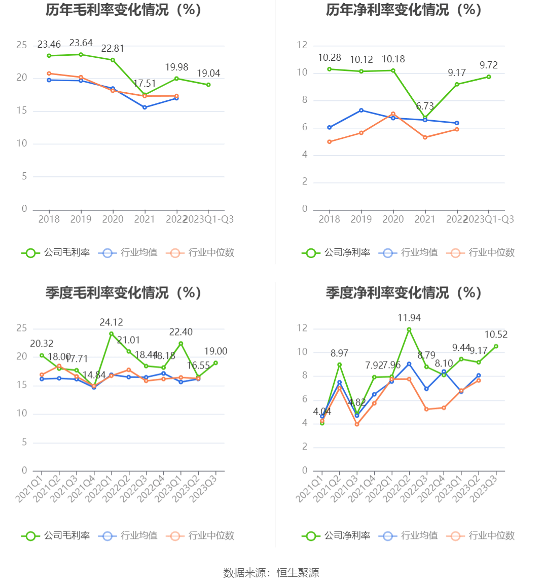 2023年前三季度,公司毛利率为19.04%,同比下降1.78个百分点;净利率为9.72%,较上年同期上升0.05个百分点。从单季度指标来看,2023年第三季度公司毛利率为19.00%,同比上升0.56个百分点,环比上升2.45个百分点;净利率为10.52%,较上年同期上升1.73个百分点,较上一季度上升1.35个百分点。