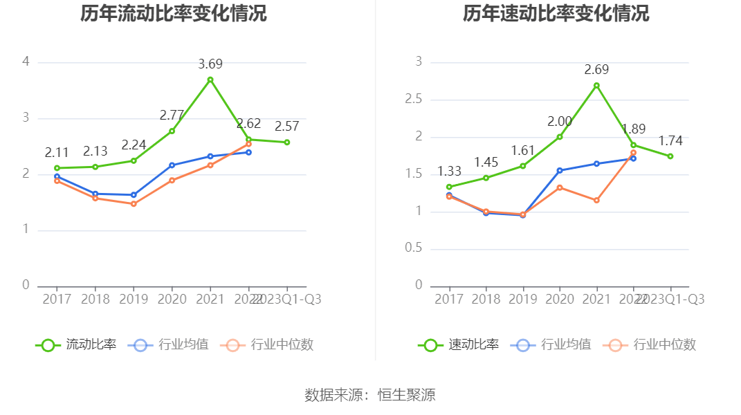 2023年前三季度,公司流动比率为2.57,速动比率为1.74。