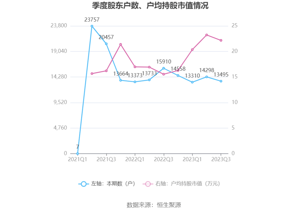 筹码集中度方面,截至2023年三季度末,公司股东总户数为1.35万户,较上半年末下降了803户,降幅5.62%;户均持股市值由上半年末的23.22万元下降至22.16万元,降幅为4.57%。