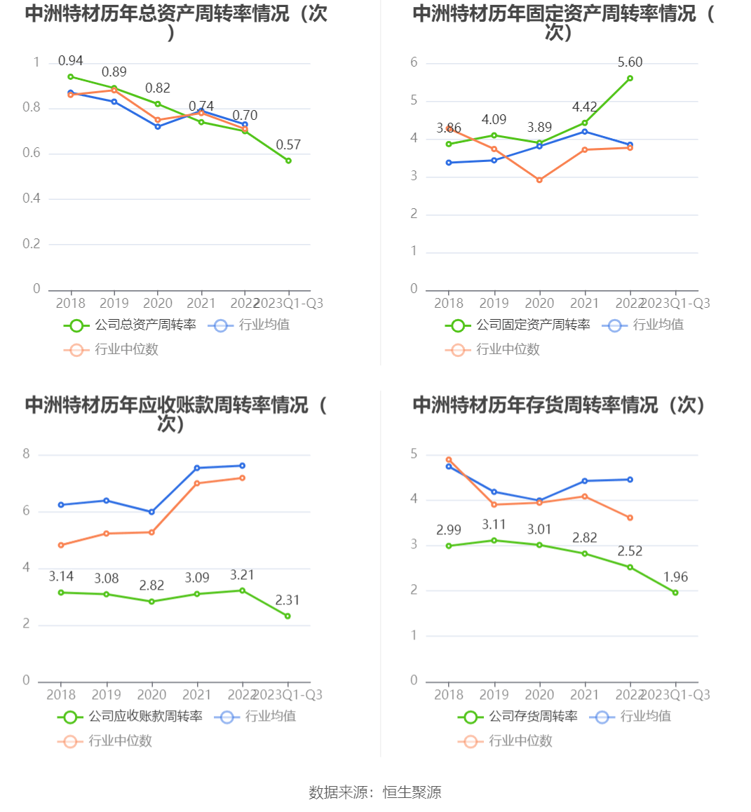 营运能力方面,2023年前三季度,公司公司总资产周转率为0.57次,上年同期为0.50次(2022年前三季度行业平均值为0.55次,公司位居同行业10/16);公司应收账款周转率、存货周转率分别为2.31次、1.96次。