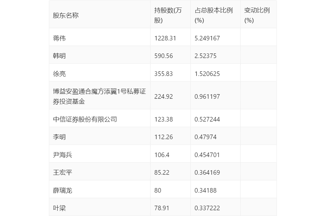 三季报显示,2023年三季度末公司十大流通股东中,新进股东为韩明、徐亮、薛瑞龙,取代了上半年末的中信里昂资产管理有限公司-客户资金-人民币资金汇入、中国国际金融股份有限公司、西部利得量化成长混合型发起式证券投资基金。在具体持股比例上,中信证券股份有限公司、叶梁持股有所上升,尹海兵持股有所下降。
