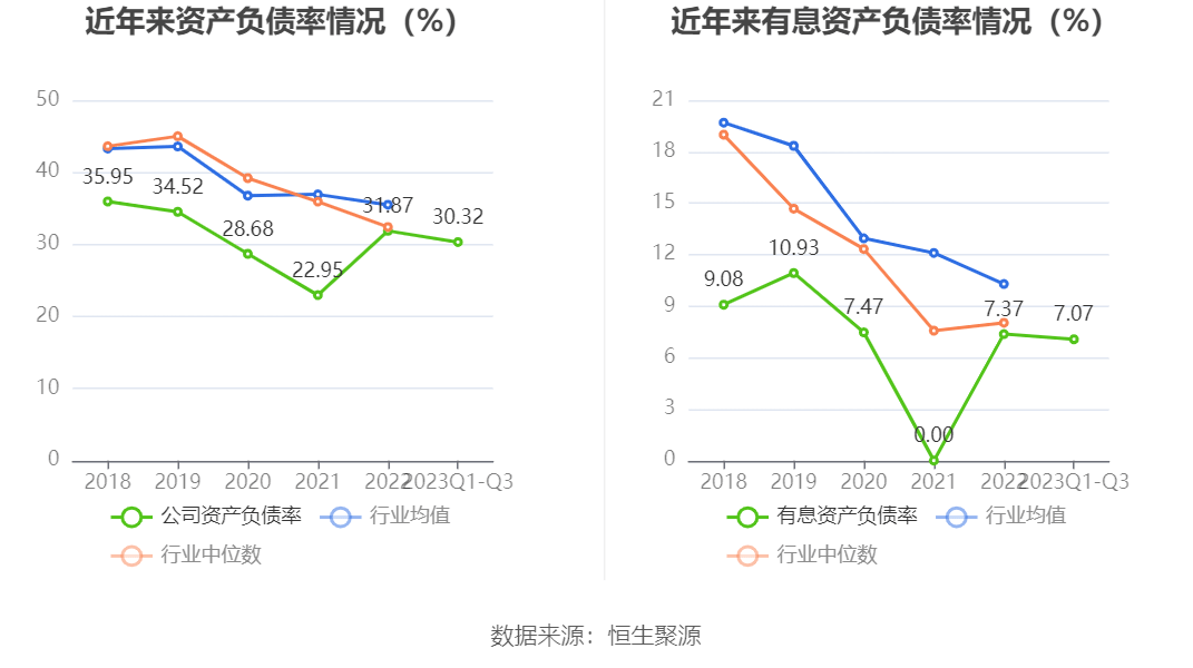 在偿债能力方面,公司2023年三季度末资产负债率为30.32%,相比上年末下降1.55个百分点;有息资产负债率为7.07%,相比上年末下降0.30个百分点。