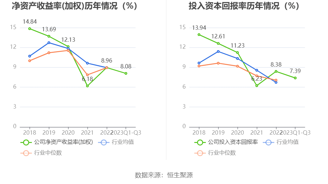 数据显示,2023年前三季度公司加权平均净资产收益率为8.08%,较上年同期增长1.56个百分点;公司2023年前三季度投入资本回报率为7.39%,较上年同期增长1.32个百分点。