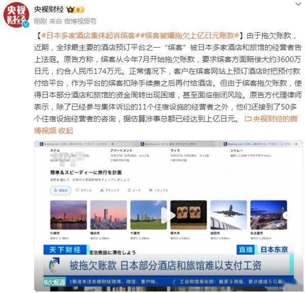 由于拖欠账款,近期,全球最主要的酒店预订平台之一“缤客”被日本多家酒店和旅馆的经营者告上法庭。原告方称,缤客从今年7月开始拖欠账款,要求缤客方面赔偿大约3600万日元,约合人民币174万元。正常情况下,客户在缤客网站上预订酒店时把预付款付给平台,作为平台的缤客扣除手续费之后再付给酒店。但由于缤客拖欠账款,使得日本部分酒店和旅馆的资金周转出现困难,甚至面临倒闭风险。原告方代理律师表示,除了已经参与集体诉讼的11个住宿设施的经营者之外,他们还接到了50多个住宿设施经营者的咨询,据估算涉事总额已经达到上亿日元。