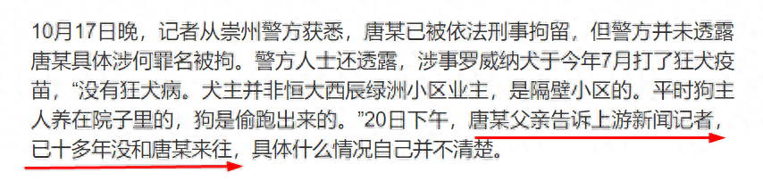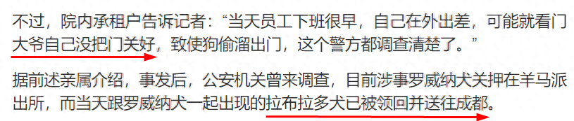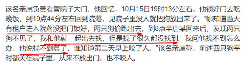 一个值得一提的细节是,媒体也采访了该别墅内的其他租户。一位租户称“当天员工下班很早,自己在外出差,可能就看门大爷自己没把门关好,致使狗偷溜出门,这个警方都调查清楚了。”