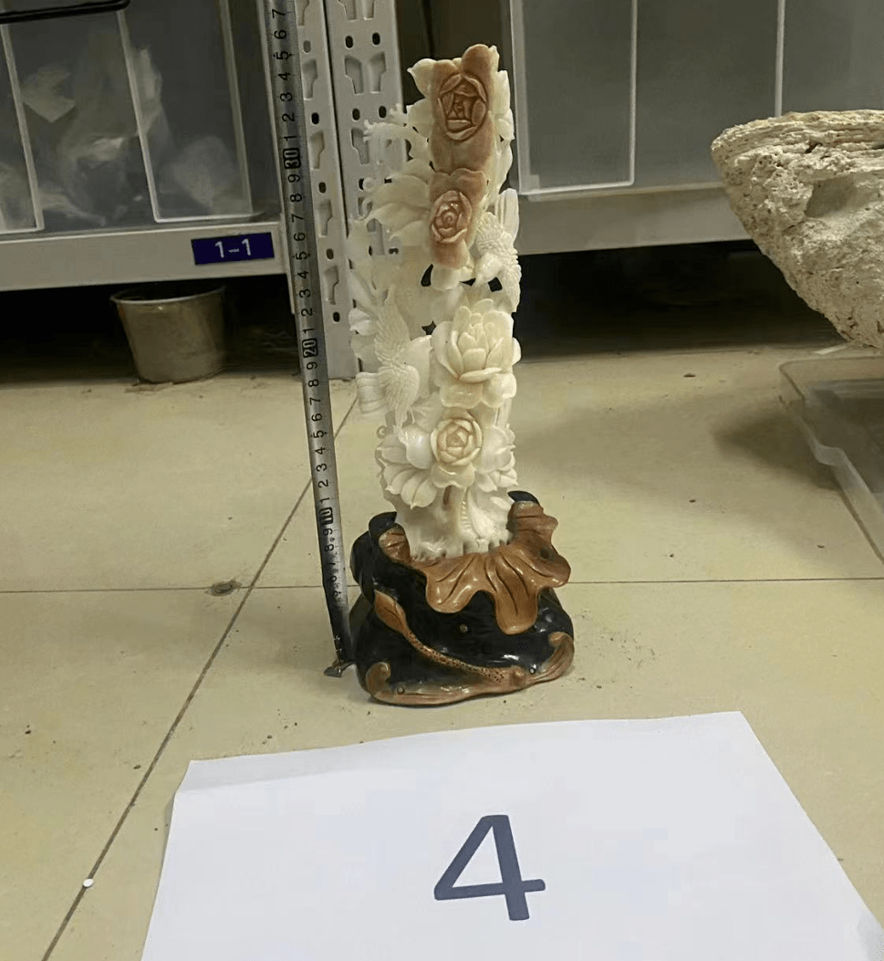 走进靳某的家里,民警一眼看见,在他家客厅醒目位置摆放着一件雕刻工艺品。靳某承认,这件工艺品的原材料是国家保护动物砗磲。随后,民警又在其他房间内查获3件砗磲制品。其中两件为砗磲原贝,另外一件与客厅内查获的摆件一样,已经进行了雕刻加工。