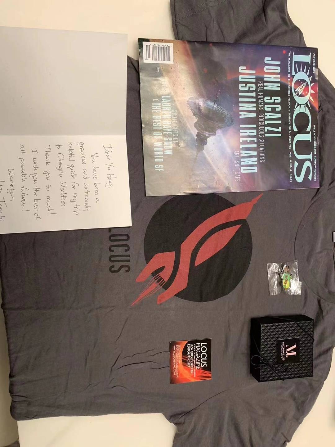 “里面有《轨迹》杂志主题T恤、最新一期《轨迹》杂志、带《轨迹》杂志LOGO的勋章、一盒巧克力,还有一封感谢信。”陈宇航说。丽泽·绰隆比感谢信中写道:“亲爱的宇航,非常感谢你。你是我这次成都科幻大会之行非常亲切的、带给我极大帮助的向导。祝你未来一切顺利。”
