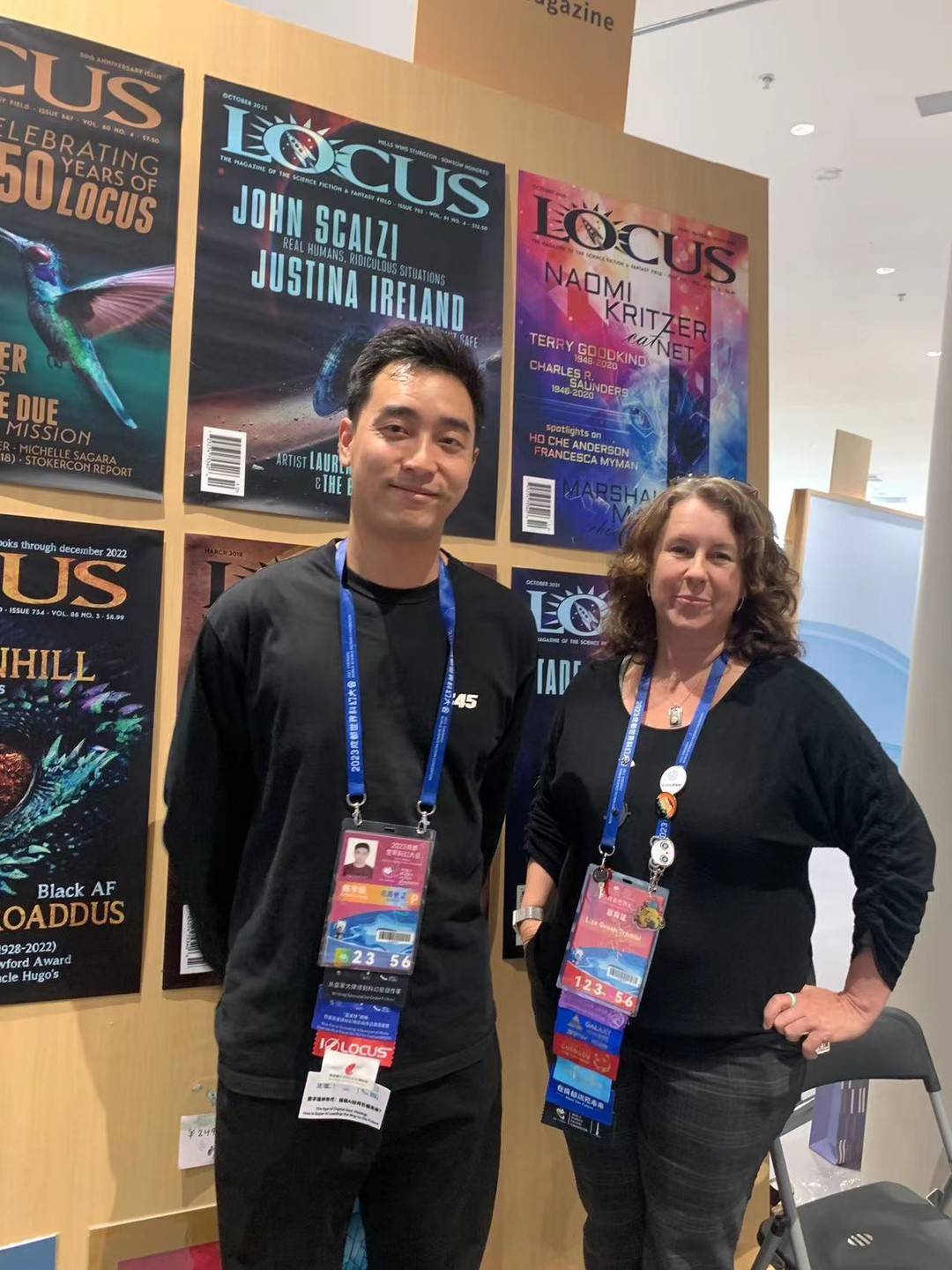 10月22日晚,2023成都世界科幻大会落下帷幕。与会嘉宾陆续踏上归程。10月23日上午,美国科幻杂志《轨迹(Locus)》主编丽泽·绰隆比离开郫都。临行前她送给过去七天为她提供帮助的志愿者陈宇航一个“大礼包”,表达感谢。