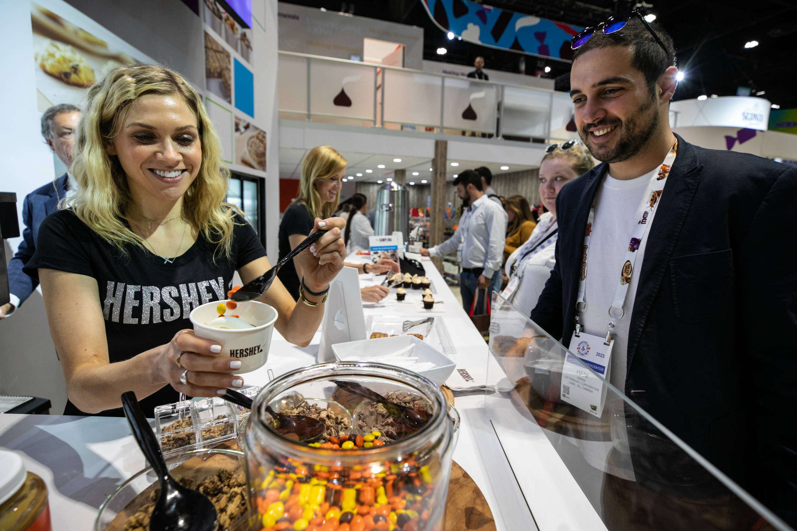 2023年5月23日,参展商在美国芝加哥举行的糖果及零食展览会上为冰淇淋加上配料。新华社发(文森特·约翰逊摄)