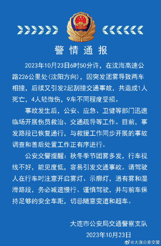 @大连公安交警 消息,2023年10月23日6时50分许,在沈海高速公路226公里处(沈阳方向),因突发团雾导致两车相撞,后续又引发2起刮撞交通事故,共造成1人死亡,4人轻微伤,9车不同程度受损。