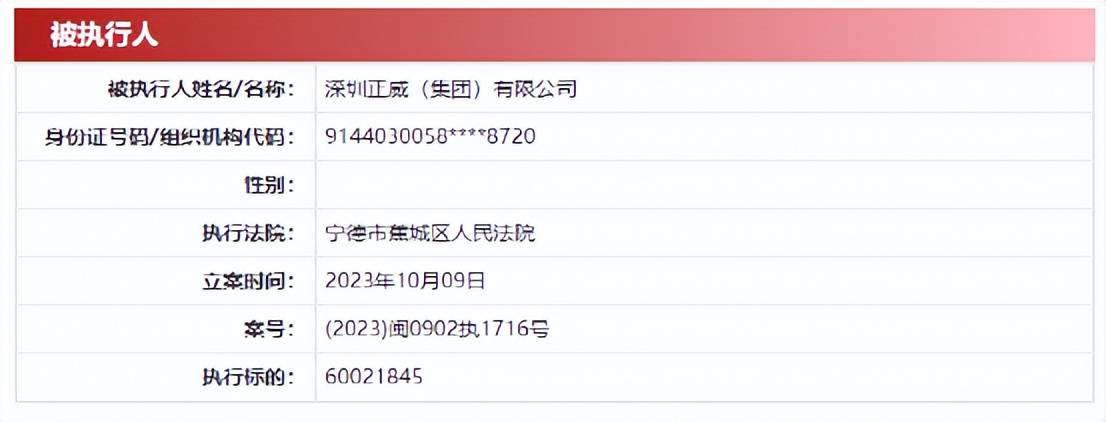 公告显示,宁德市蕉城区人民法院于10月9日立案执行申请人宁德市交投实业发展有限公司(以下简称:宁德交投)申请执行深圳正威(集团)有限公司(以下简称:正威集团)合同纠纷一案,因正威集团未按执行通知书指定的期间履行生效法律文书确定的给付义务,法院向正威集团发布(2023)闽0902执1716号限制消费令,王文银作为正威集团的法定代表人被一并限制高消费。