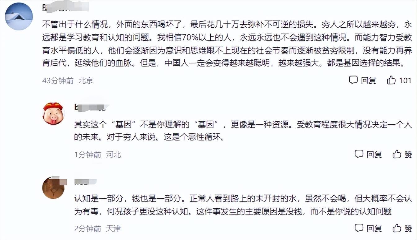 老人拾荒也是为了补贴家用,减轻儿女的经济压力。据说当时两个孩子就觉得味道不对,不一会儿就肚子疼了。奶奶现在十分懊悔,直呼孩子有个三长两短自己也不活了,孩子父母还要花时间开解老人。网友心疼两个孩子,更心疼他们的父母。