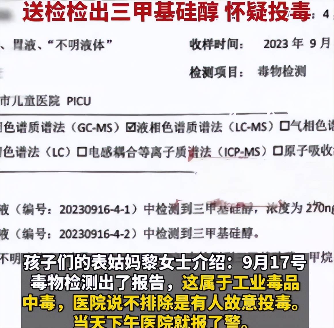 经医院诊断发现,兄妹俩并非普通的食物中毒,而是三甲基硅醇中毒,这是一种常见的工业化学品,含有剧毒,对人体伤害性极大。即便是不小心沾到皮肤上都要马上冲洗处理,何况是这么小的孩子喝下去。