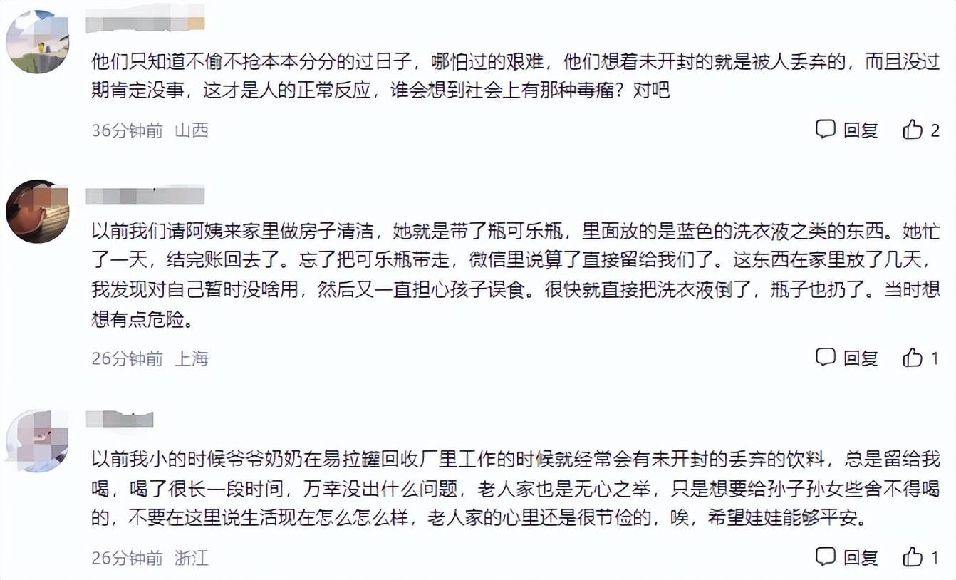 无论是哪种原因,都要对投毒之人绳之以法,同时大家也要避免食用来历不明的东西,避免给违法人员留下可乘之机。很多网友对此表示不理解,这都什么年代了,还能有人捡饮料喝?还给孩子喝?这是亲奶奶吗?
