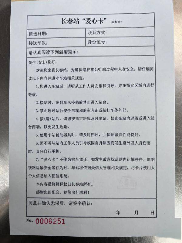 “爱心卡”当日当次列车有效,如需再进站,请重新办理。“爱心卡”不作为乘车凭证,如发生故意扰乱站内运输秩序、影响铁路运输安全等行为时,车站将依据失信人管理相关规定,将卡片使用人个人信息纳入征信系统。
