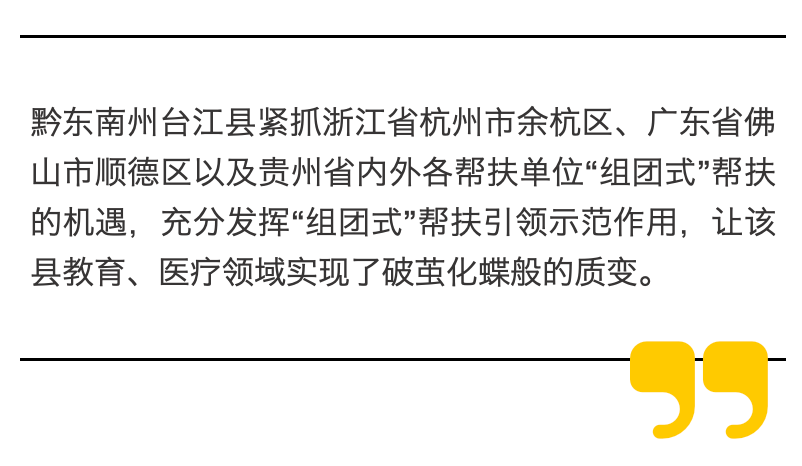 近年来,黔东南州台江县紧抓浙江省杭州市余杭区、广东省佛山市顺德区以及贵州省内外各帮扶单位“组团式”帮扶的机遇,充分发挥“组团式”帮扶引领示范作用,让该县教育、医疗领域实现了破茧化蝶般的质变。