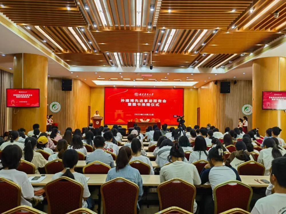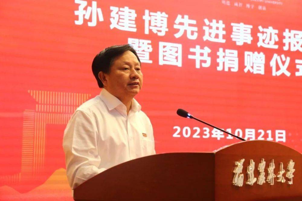 10月21日上午,福建农林大学在常盛会议中心举行孙建博先进事迹报告会暨图书捐赠仪式,第十二届、十三届全国人大代表、“林业英雄”、原山林场发展战略委员会主任孙建博作先进事迹报告并捐赠图书,福建农林大学校长兰思仁致辞,福建省国有林场发展中心副主任(主持工作)陈雄、副主任陈良昌,福建省洋口国有林场场长游云飞,福建农林大学团委书记周娟娟、图书馆党委书记陈月霄、林学院党委书记蓝天水等领导出席活动,福建农林大学党委宣传部部长阮晓菁主持活动。