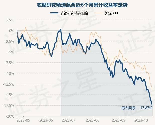证券之星消息,10月23日,农银研究精选混合最新单位净值为3.3246元,累计净值为3.3246元,较前一交易日下跌1.13%。历史数据显示该基金近1个月下跌7.84%,近3个月下跌13.38%,近6个月下跌17.67%,近1年下跌19.48%。该基金近6个月的累计收益率走势如下图: