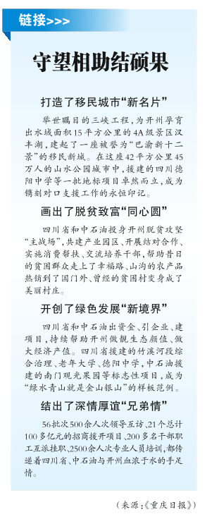 1992年以来,四川省和中石油积极响应党中央、国务院号召,以高度的政治责任感、使命感,发扬讲大局、讲感情、讲奉献精神,扎实有效地开展对口支援工作,充分发挥自身所能,援助开州所需,投入4亿多元实施项目672个,充分彰显了心手相连、守望相助的大爱境界。