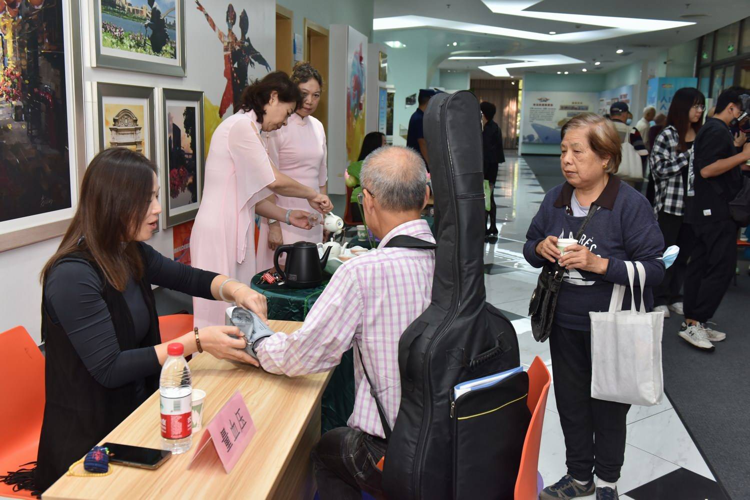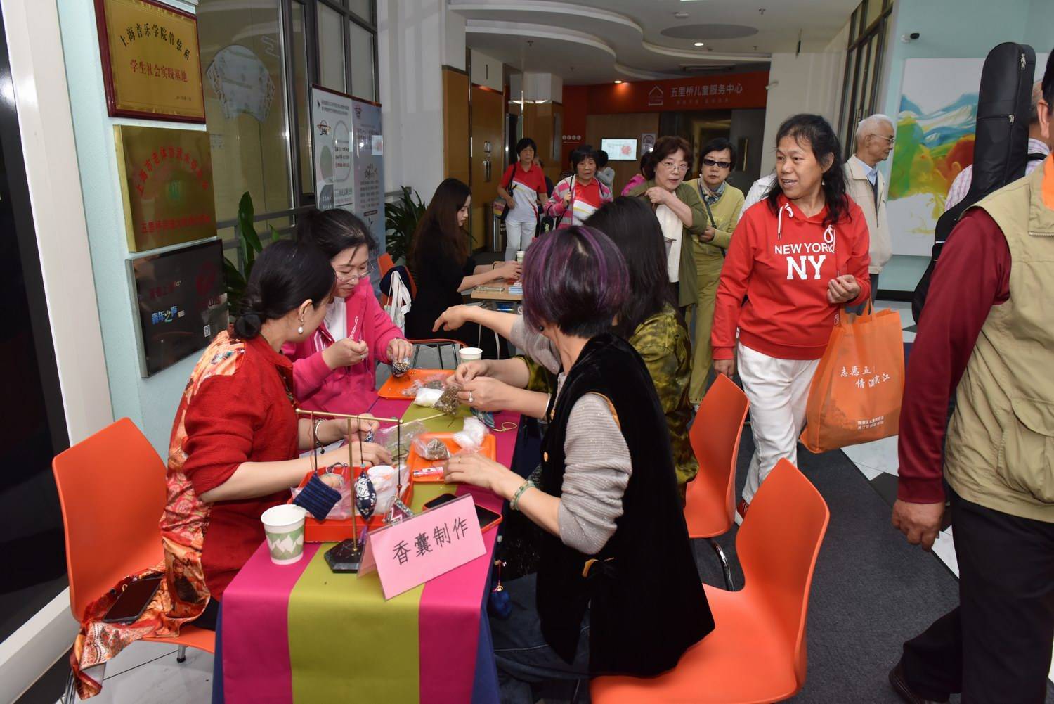当天,五里桥社区文化活动中心一楼展厅还举行了公益便民服务。社区志愿者摆摊向老年群体提供专业的测血压、运动体验、牙科义诊、手工香囊、防诈宣传和消防安全等服务。在志愿者的引导下,老年人根据自己的需求穿梭于摊位间,享受着便捷又温馨的服务。