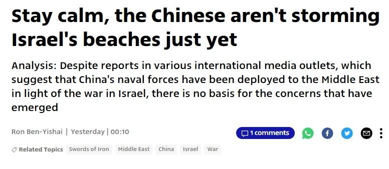 写出如此“惊悚”报道的,还有以色列《新消息报》旗下的新闻门户网站。这篇报道的作者还煞有介事地呼吁“保持冷静,中国还没有袭击以色列海滩”,并头头是道地分析了“中国在中东地区部署的军事力量不太能介入当前巴以冲突。”