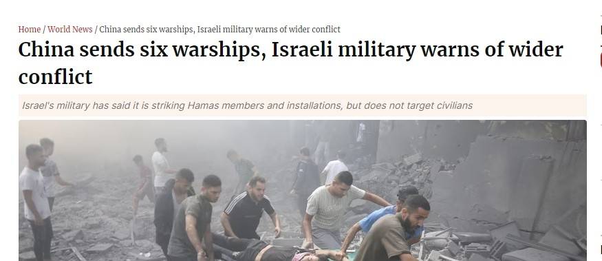 其他媒体,诸如美国“海军情报”网站、《欧亚时报》和CNN等媒体的报道虽然没有上述两篇新闻那么惊悚,但也将“中国6艘军舰”与“巴以局势升级”和“美国航母打击群”联系起来。