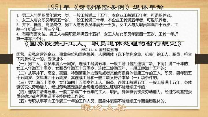 1957年《国务院关于工人职员退休处理的暂行规定》,主要是针对国家《劳动保险条例》退休年龄规定覆盖人员不完善所做出的全面统一。这里边有几项新的修订,主要是女性职员退休年龄改为了55周岁,另外一般工龄都降低了5年。新增了失去劳动能力提前退休的两项规定。
