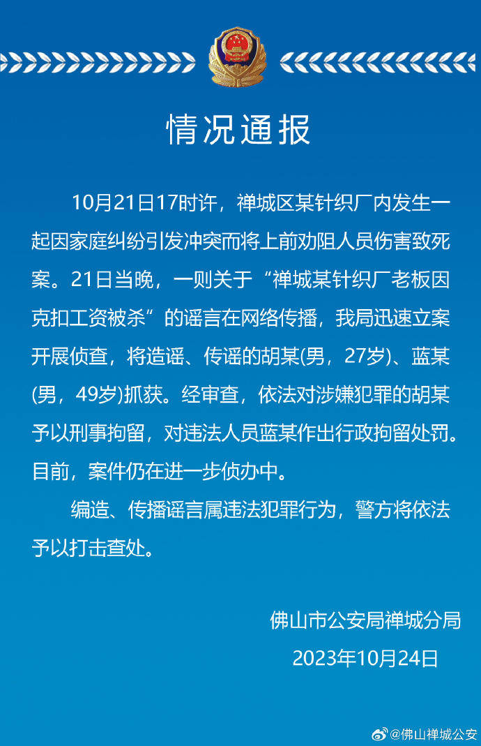 原标题:佛山一针织厂老板因克扣工资被杀?警方:两男子造谣传谣被抓
