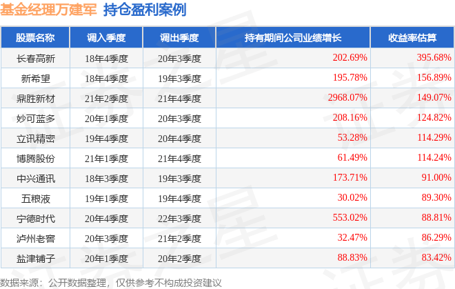 万建军管理的华安研究精选混合A基金在18年4季度买入长春高新,在持有1年又3个季度后在20年3季度卖出。持有期间的估算收益率为395.68%,持有期间长春高新在2018年到2020年的年报归属净利润增幅达202.69%。
