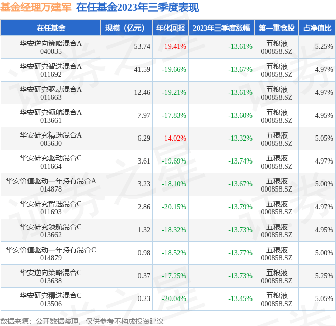 证券之星消息,截止2023年三季度末,基金经理万建军旗下共管理12只基金,本季度表现最佳的为华安研究精选混合A(005630),季度净值跌13.32%。