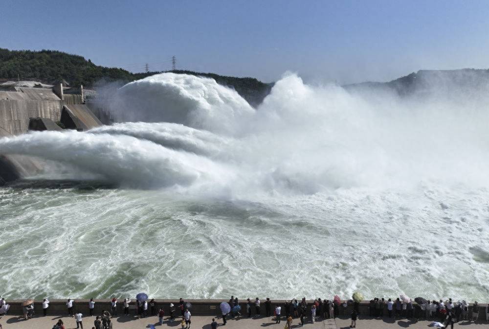 游客在黄河小浪底水利枢纽工程出水口观看调水调沙(2023年6月23日摄,无人机照片)。新华社发(苗秋闹 摄)