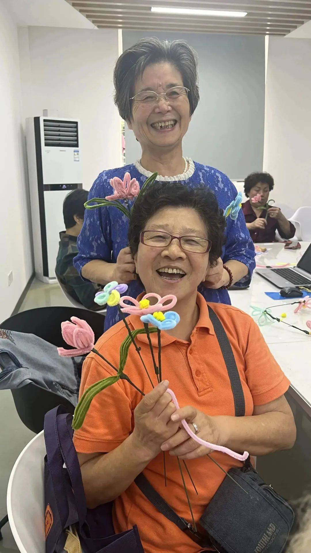活动现场,指导老师向阿姨们提供了扭扭花材料,并向大家讲解了步骤。在大家的认真制作下,一朵朵美丽的花朵在手中绽放。看着一束束色彩鲜艳的扭扭花,阿姨们脸上洋溢着欢乐的笑容。