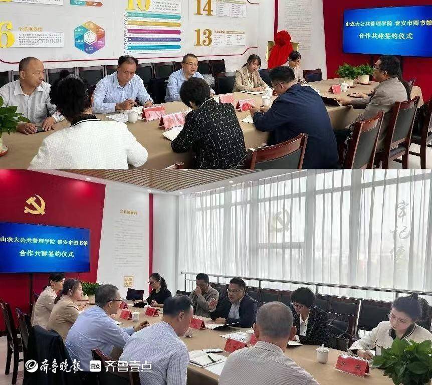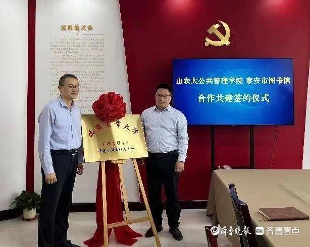 现场,双方签署《山东农业大学公共管理学院与泰安市图书馆共建研究生联合培养基地协议》,徐宣国和闫晨为联合培养基地揭牌。
