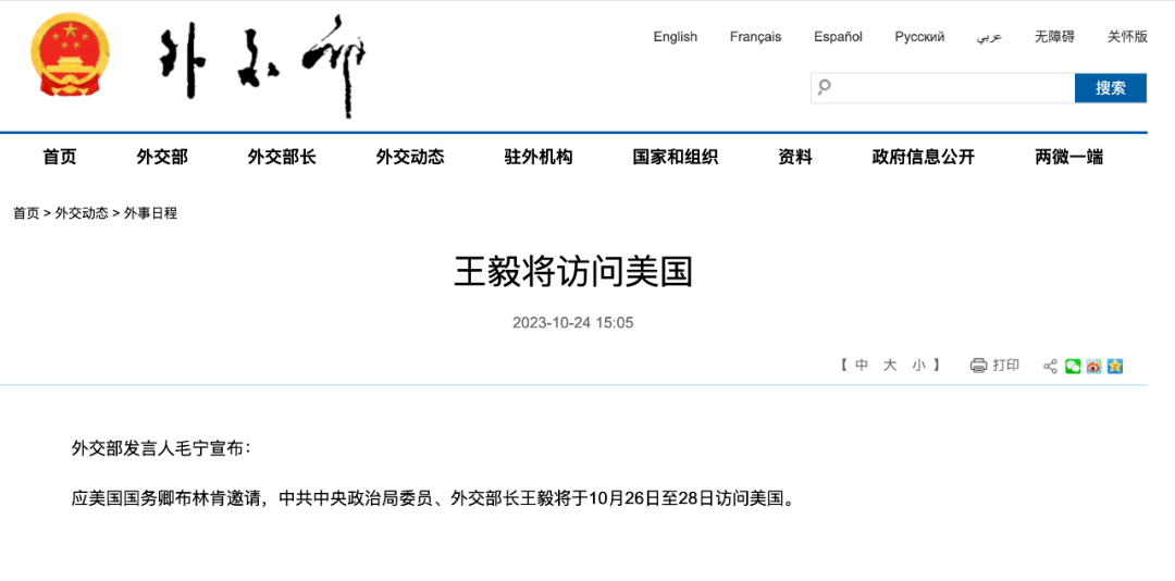 应美国国务卿布林肯邀请,中共中央政治局委员、外交部长王毅将于10月26日至28日访问美国。