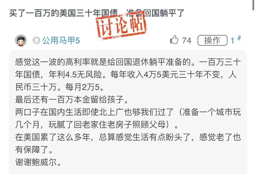 于是有人表示,100万美元买美债,4.5%(目前已超过5%)的无风险到期收益,买完啥都不用干,实现30年月入人民币3万,完全可以躺平了。