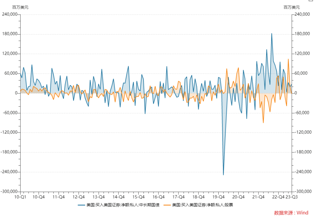 从长期收益率水平比较,美股过去30年间,平均年化收益率达到8%-10%,远超美债。目前美国财政部数据也显示,海外私人投资者买入美国股票净额以超越买入长期债券净额,也就是说,海外投资者对美股的偏好相对债券走高。