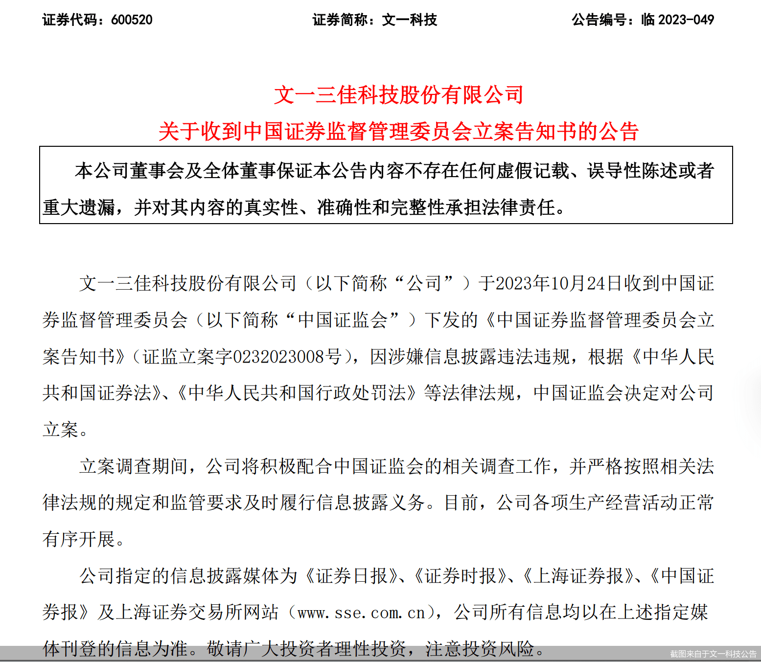 公告显示,文一科技于10月24日收到中国证监会下发的立案告知书,因涉嫌信息披露违法违规,根据《中华人民共和国证券法》《中华人民共和国行政处罚法》等法律法规,中国证监会决定对公司立案。