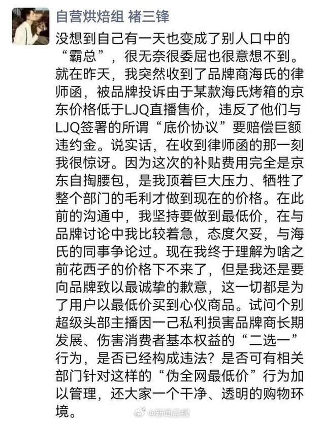 据澎湃新闻报道,10月24日,京东采销人员在朋友圈公开喊话称李佳琦“二选一”。该工作人员表示,京东收到了品牌商海氏的律师函,被品牌投诉由于某款海氏烤箱的京东价格低于李佳琦直播售价,违反了他们与李佳琦签署的“底价协议”,并要求赔偿巨额违约金。