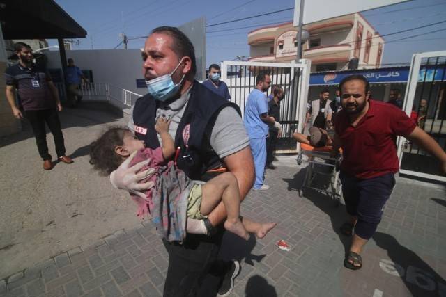 10月23日,在加沙地带南部城市拉法,人们将伤者送往医院。新华社发(哈立德·奥马尔摄)