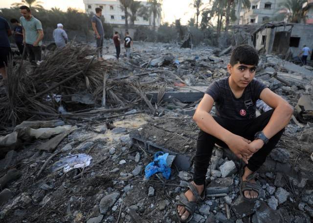 10月23日,在加沙地带南部城市汗尤尼斯,一名男孩坐在遭以色列空袭后的建筑废墟上。新华社发(亚西尔·库迪摄)