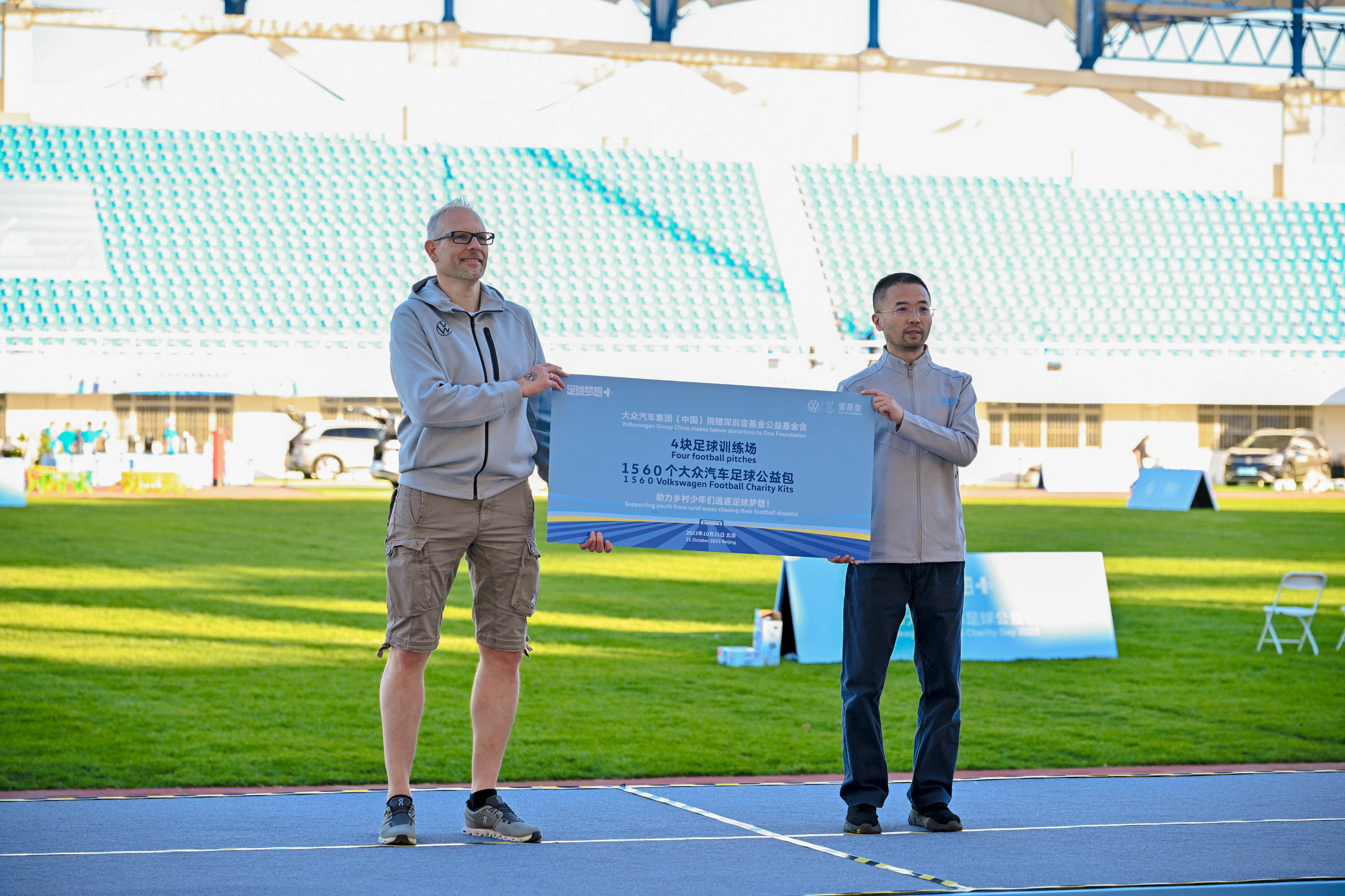 2023年10月23日,由大众汽车与公益合作伙伴壹基金共同发起的大众汽车足球公益日在北京成功举办。通过本次活动,大众汽车向青海、甘肃及四川省欠发达地区的学校捐赠4块足球训练场和1560套“大众汽车足球公益包”。近600名参与者在本届足球公益日活动中尽情享受足球的乐趣,积极参与志愿行动,与大众汽车一起支持青少年足球发展。活动涵盖了沃尔夫斯堡足球俱乐部青训、丰富的足球互动挑战及ID.后备箱足球市集,并邀请了两支来自乡村学校的青少年足球队进行了一场激动人心的“ID.杯”足球友谊赛,将活动气氛拉向高潮。