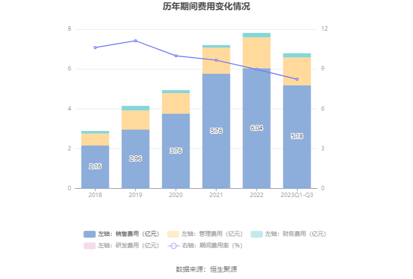 2023年前三季度,公司期间费用为6.79亿元,较上年同期增加6695.08万元;期间费用率为8.23%,较上年同期上升0.05个百分点。其中,销售费用同比增长7.6%,管理费用同比增长20.88%,财务费用同比增长42.03%。