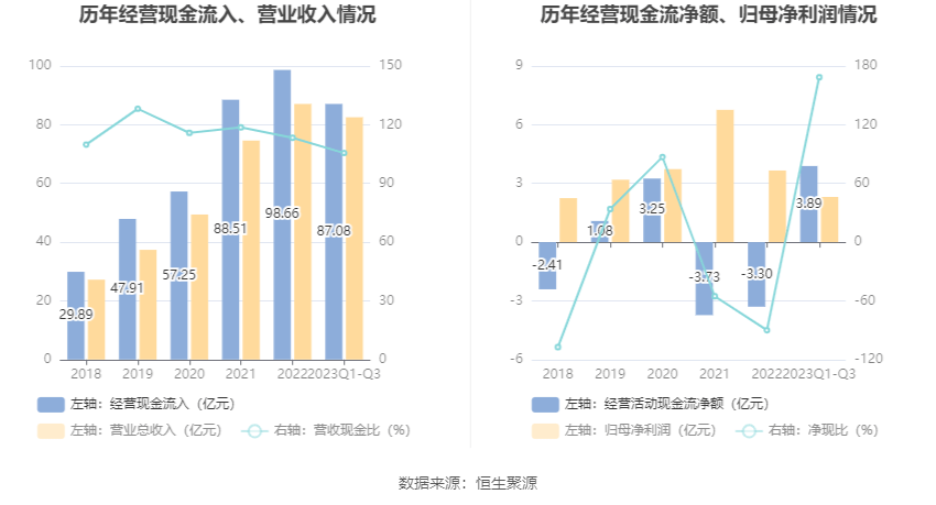 进一步统计发现,2023年前三季度公司自由现金流为10.84亿元,相比上年同期增长191.72%。