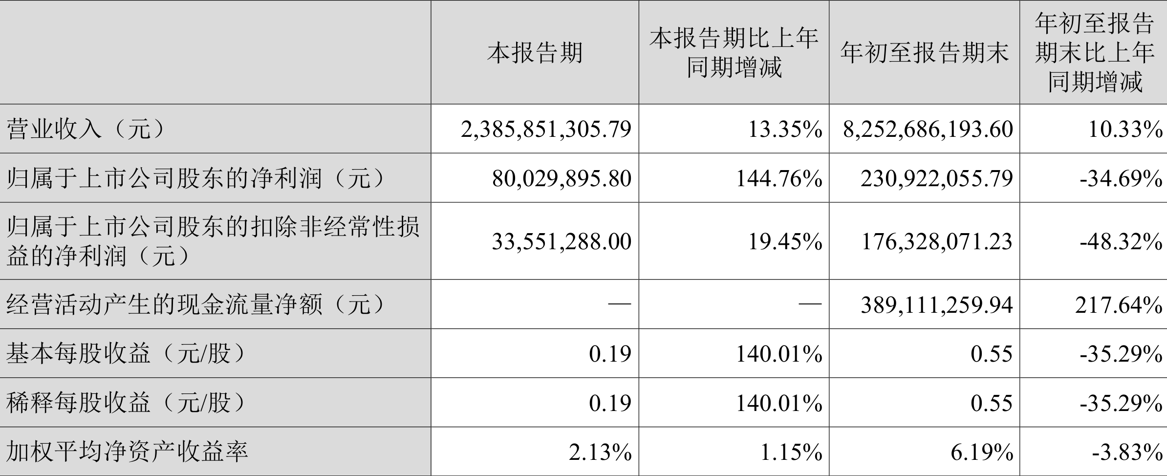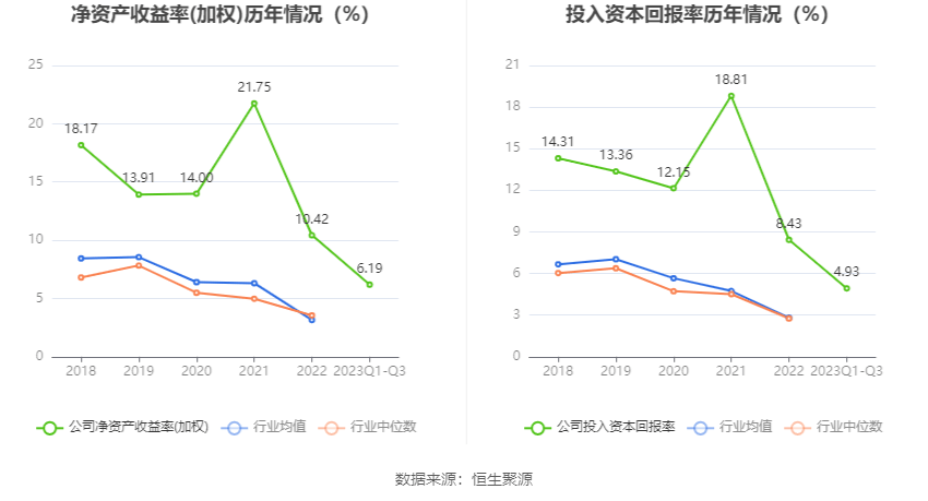 数据显示,2023年前三季度公司加权平均净资产收益率为6.19%,较上年同期下降3.83个百分点;公司2023年前三季度投入资本回报率为4.93%,较上年同期下降3.70个百分点。